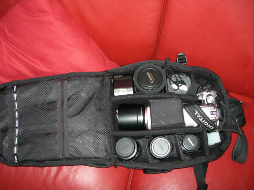 This is the inside. It holds a lot of things but it's a pain sometimes. It's a backpack so you have to take it off, lay it down, and open it to get things out of it.